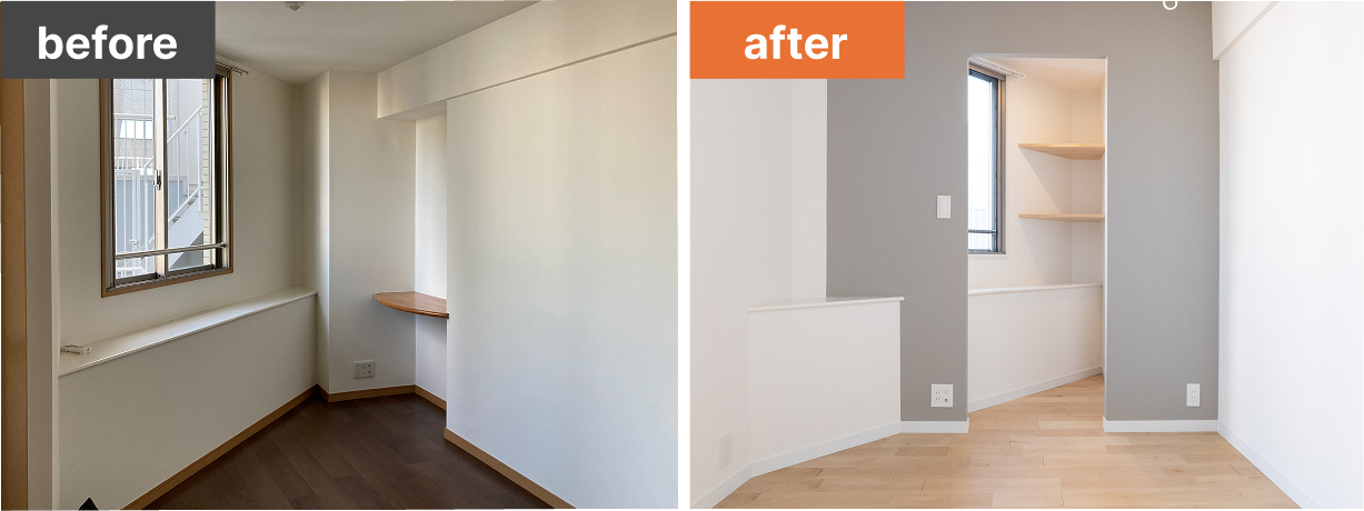 お部屋のデッドスペースとなりがちだった変形部分を活かし、ウォークインクローゼットとして活用。アクセントクロスを施すことで、お部屋のポイントへと昇華させました。また、入居様の懸念となりやすい3点ユニットバスは分離し、独立洗面台とシャワーブースを新設しました。