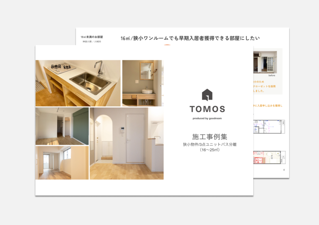 資料請求(狭小物件の施工事例集) 16〜25㎡の単身向け物件に特化したリノベーション事例集です。入居者様から敬遠されがちな3点ユニットバスを分離し、快適性を高めた事例や、築年数の古い物件を現代のライフスタイルに合わせて再生した事例をご紹介しています。小規模物件でも賃料アップ・入居率向上を実現した実例をぜひご覧ください。 資料は以下のフォームよりご申請ください。フォーム送信後、ダウンロードページが表示されます。