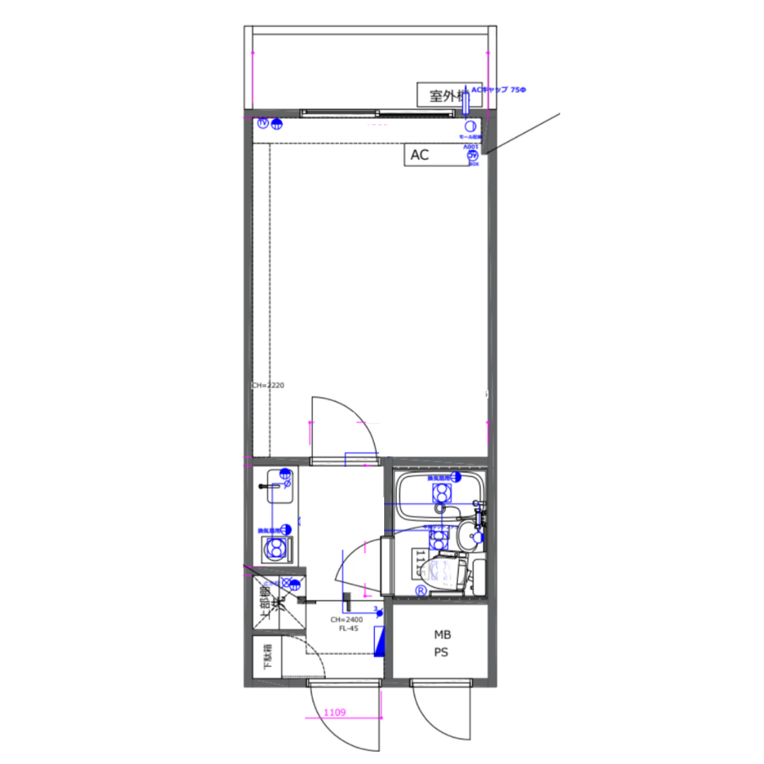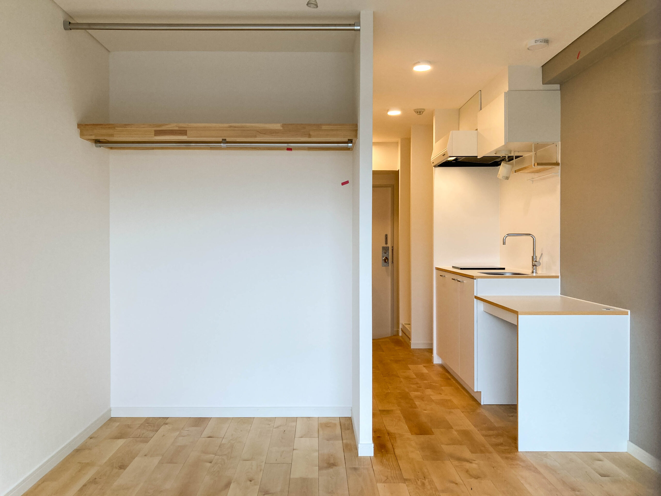 1K→ワンルームに変更。オープンクローゼットにすることで、平米数以上に広く感じられます。