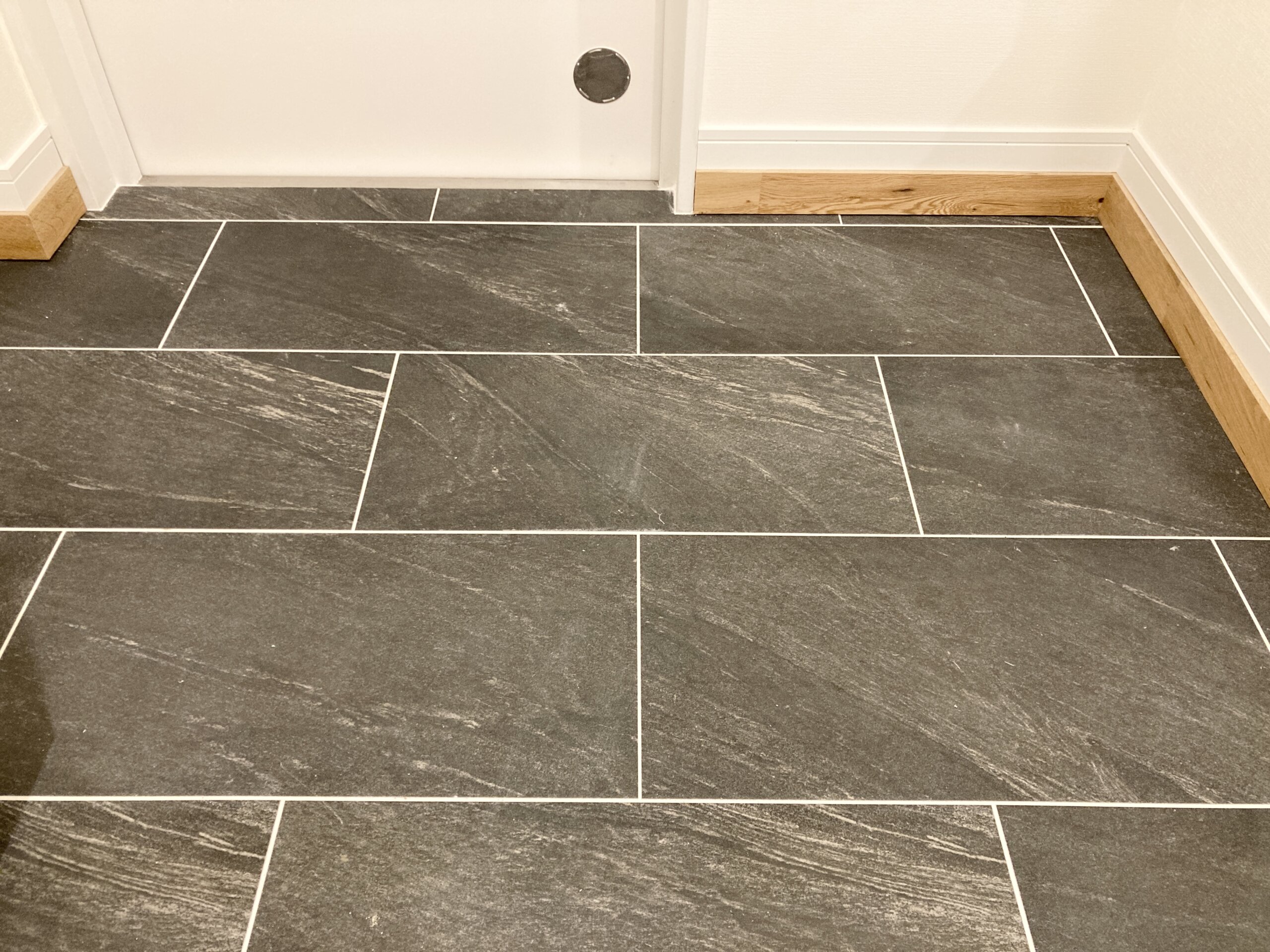 お手入れがしやすく、高級感もある土間の玄関に変更しました。